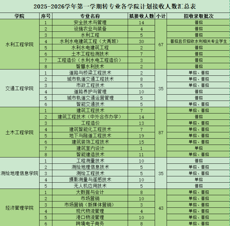 现将各专业可接纳转专业学生的计划数及接受条件进行公布,凡有意向转专业的学生请于12月26日前填写《河南水利与环境职业学院学生转专业申请表》(见附件)交至所在学院。