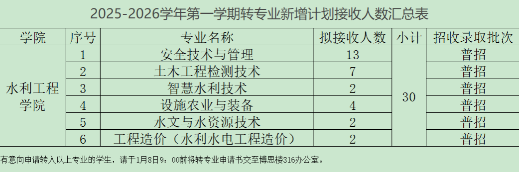 2025-2026学年第一学期转专业新增计划接收人数汇总表